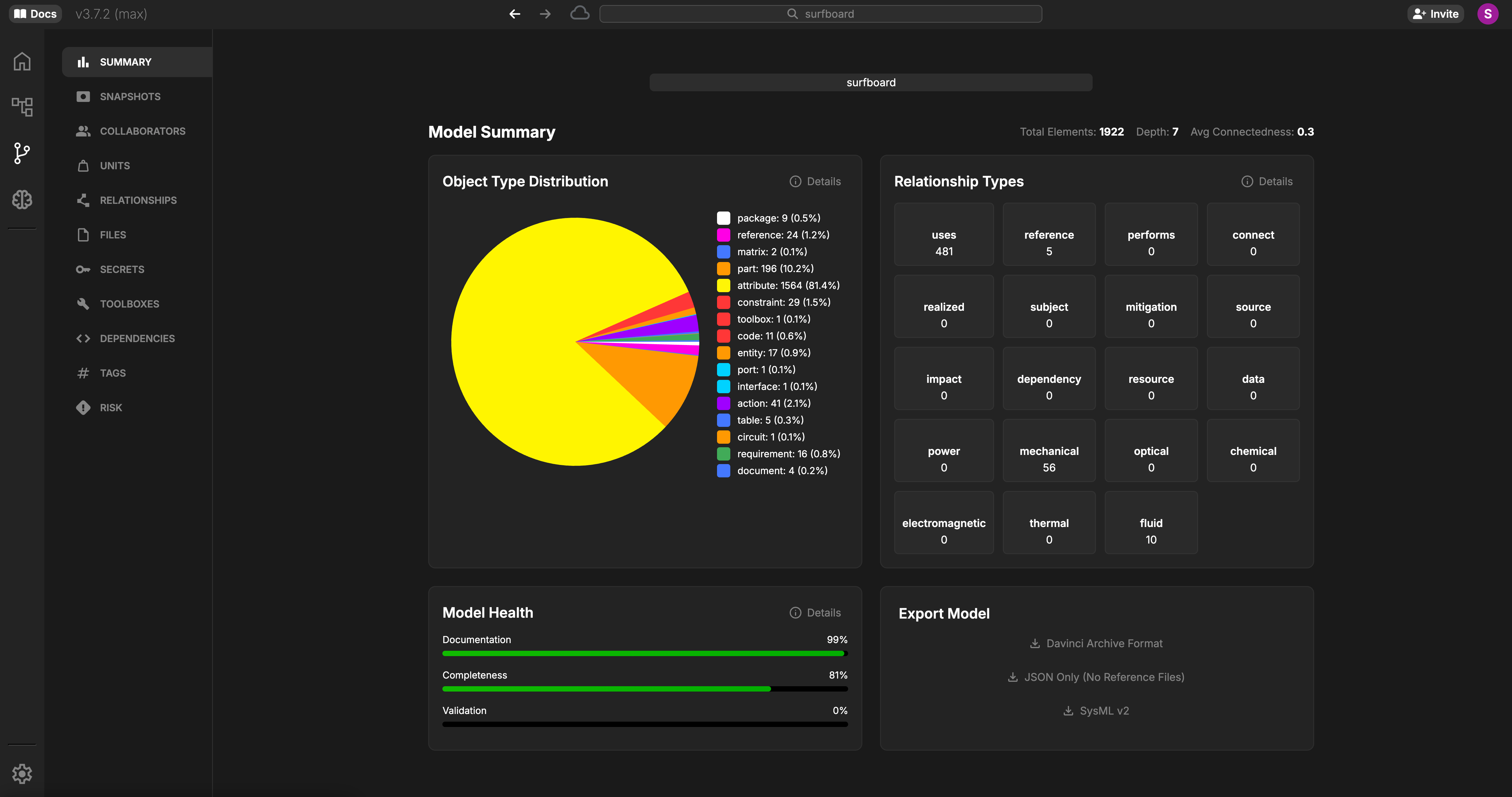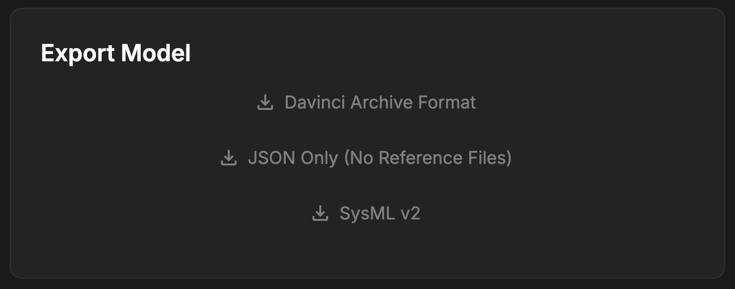 The Export Model section allows you to export your Model in 3 different formats:Davinci Archive Format (.DAF): .DAF is the best way to export a Davinci model for archive, storage, or sharing with other Davinci users without collaboration. .DAF exports both regular model objects, as well as uploaded reference files. It is a true 1:1 export of the entire model.JSON: Export your Model entirely in JSON. JSON exporting will not include uploaded reference files. Only non-reference model object types will be included in this export.SysML v2: Export your Model in the standard SysML v2 standard format. Useful when interfacing with other tools that rely on SysML formatting to process data.