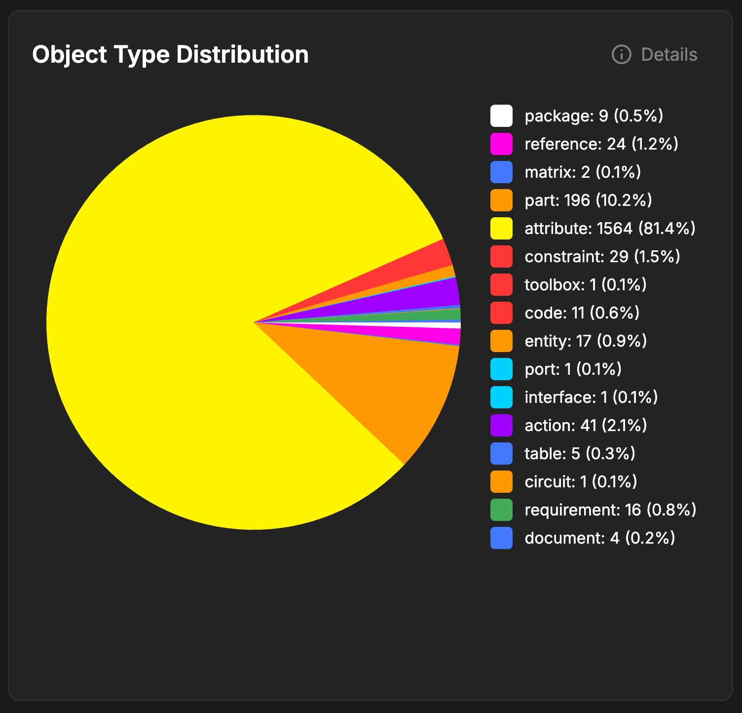 The Object Type Distribution graph is a visual representation of the elements that make up your Model. It also includes a statistical breakdown of the elements in your model. Click onDetails to get a tabluated view of the statistics.