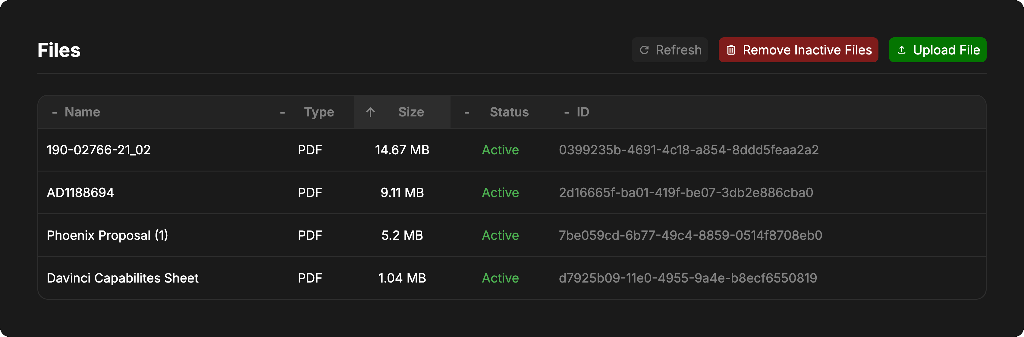 Click on any column header to sort by that column. Click again to reverse the sort direction. The table supports sorting by name, type, size, status, and ID.Refreshing the File List