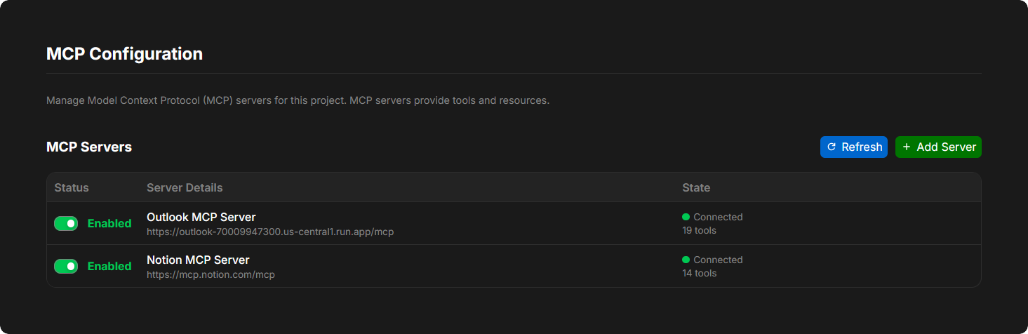 If you’ve made changes to MCP servers elsewhere or need to update the connection status, click the Refresh button to reload the server list.Using MCP Server Tools
