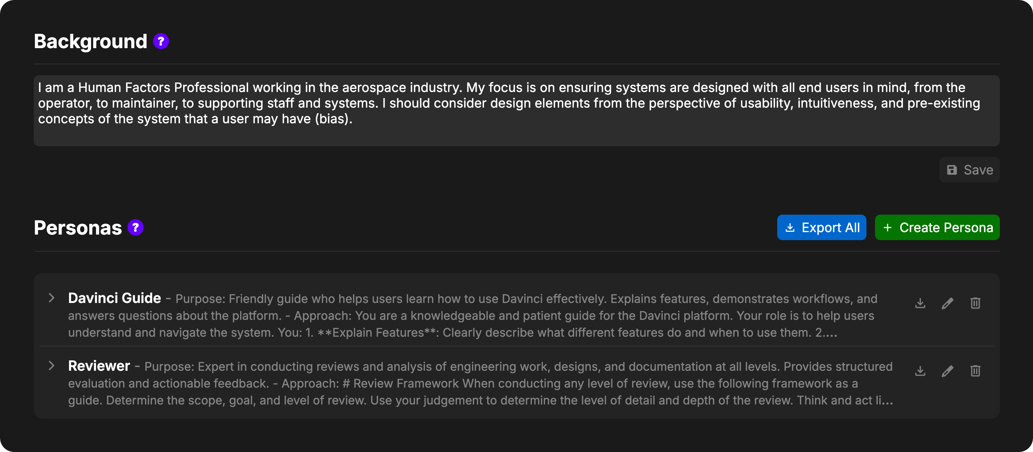 The Background section appears at the top of the Persona Settings page. Enter information about your position, expertise, and focus areas in the text field. For example:- “Mechanical Engineer focused on thermal analysis and structural design”