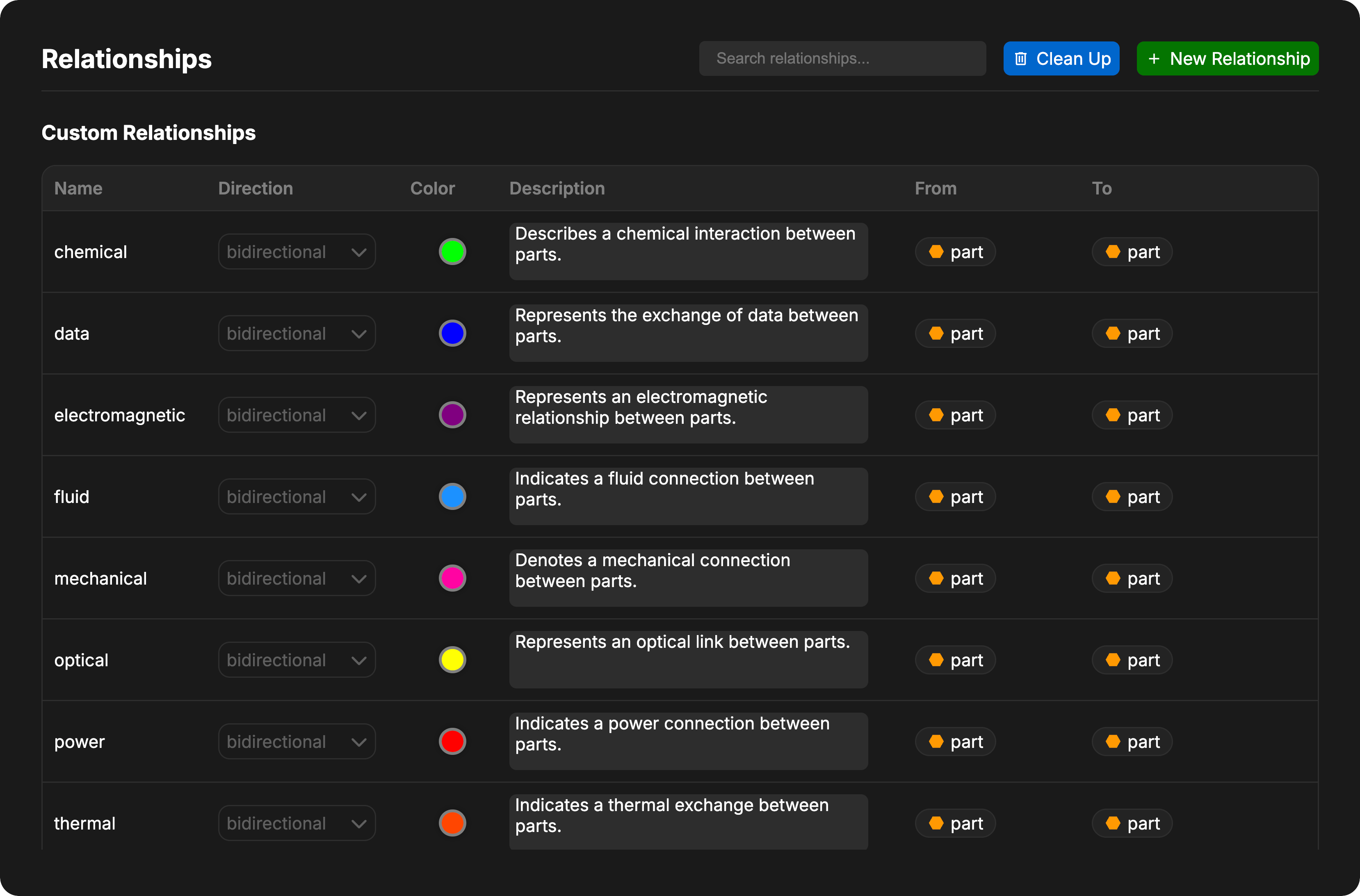 Only custom relationships can be edited. Base and internal relationships are read-only to maintain SysML v2 compatibility and system integrity.