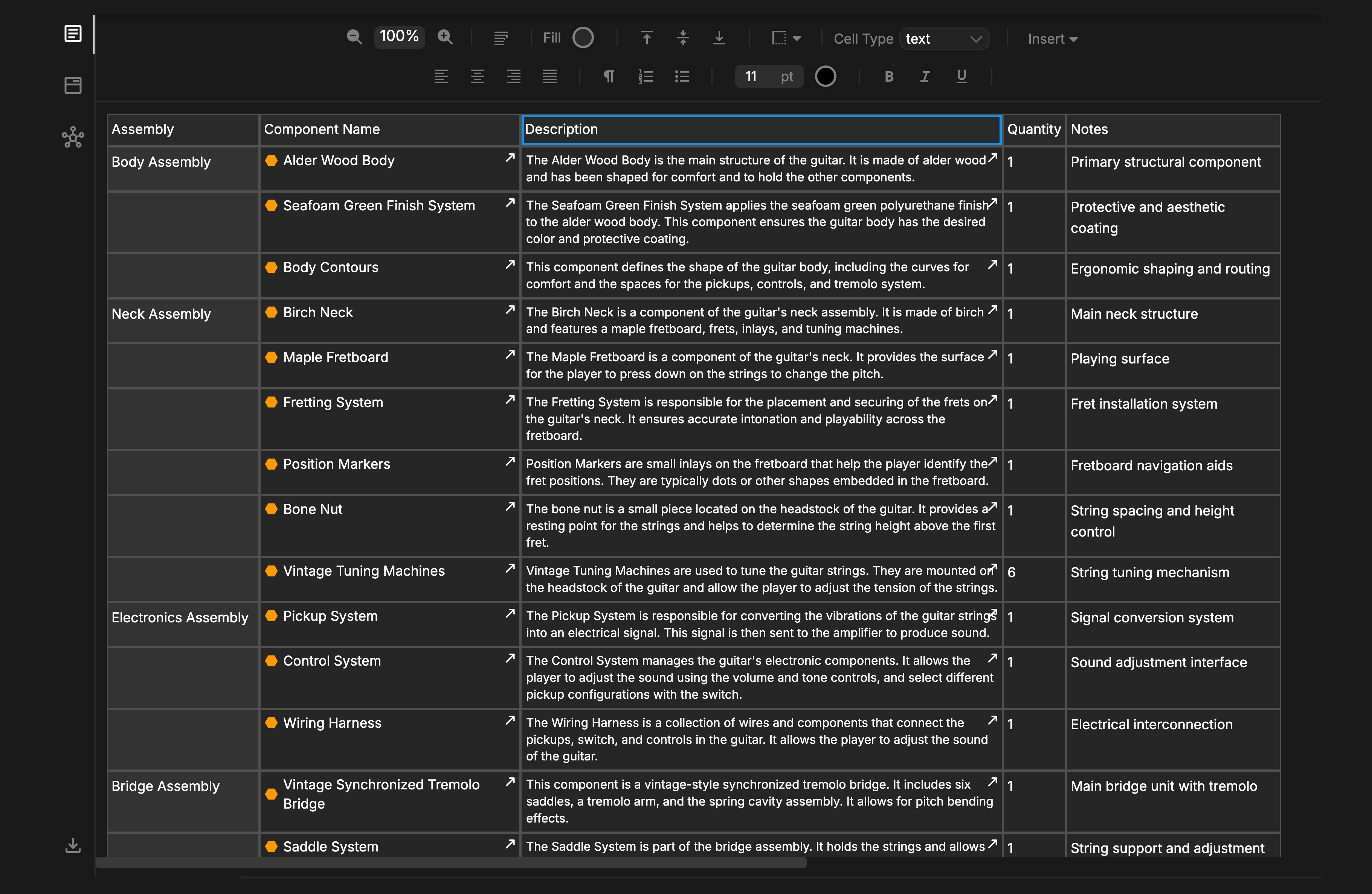 Table cells can be either text or a reference to an object. Text cells can have paragraphs or lists (bulleted or numbered) and include all the same text editing features as a document block.