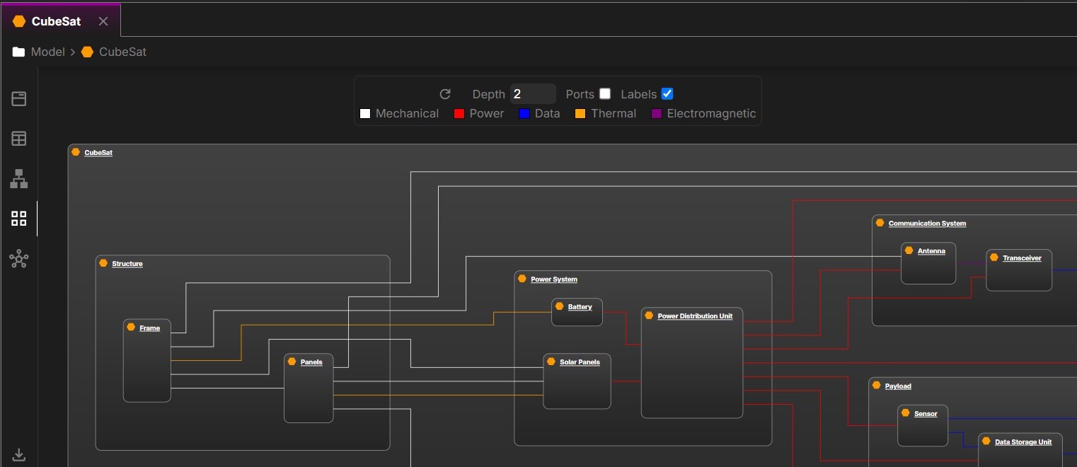 The Block View illustrates relationships between different parts and any port interfaces between them in a block diagram format.