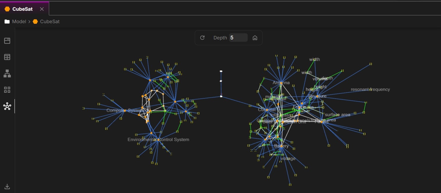 The Digital Thread View visualizes relationships between objects in a 3D space, based on the number of connections and their density. You can specify the depth relative to the focus object.