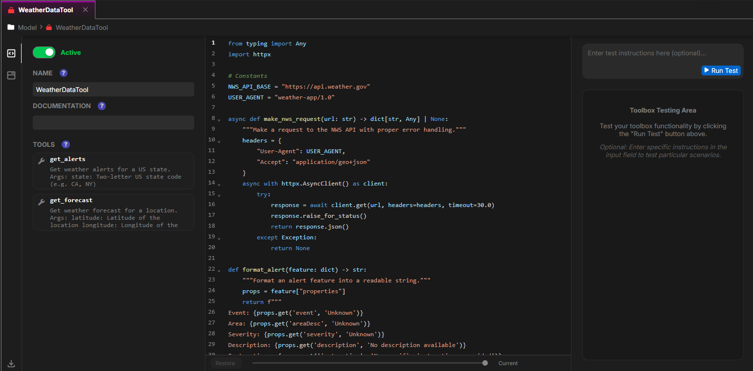Below is an example of a toolbox that provides weather information from the National Weather Service API:davinci.tool() decorator. This decorator is used to mark the function as a tool. The list on the left panel will display each tool as gathered by the decorators.