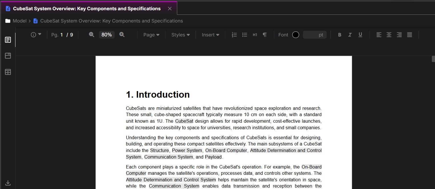 Documents are structured using blocks which can be given different display types, such as a bulleted list, heading, or simple paragraph. These blocks can also be references to other artifact objects, like a table. In these blocks the editing panel will respond to what kind of object is being edited.
