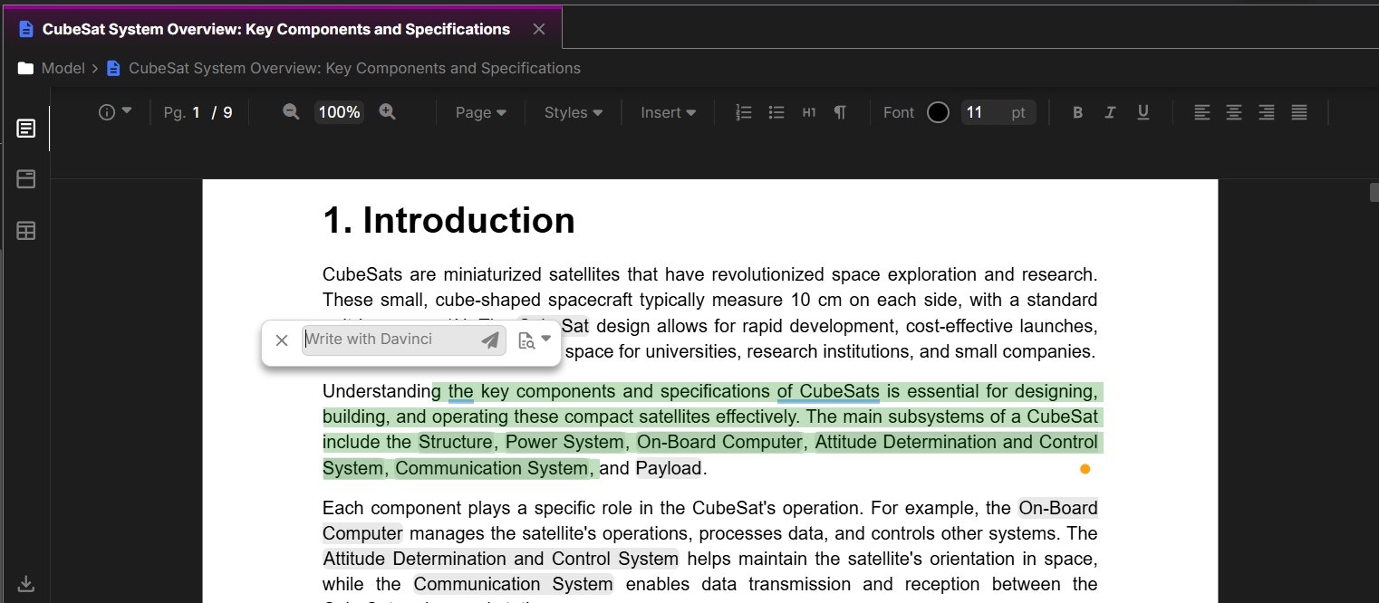 You can use Davinci to make inline edits by selecting a range of text. Once selected a popup will appear and selecting the edit icon will make a input window open to allow instructions to edit specific areas of the document.
